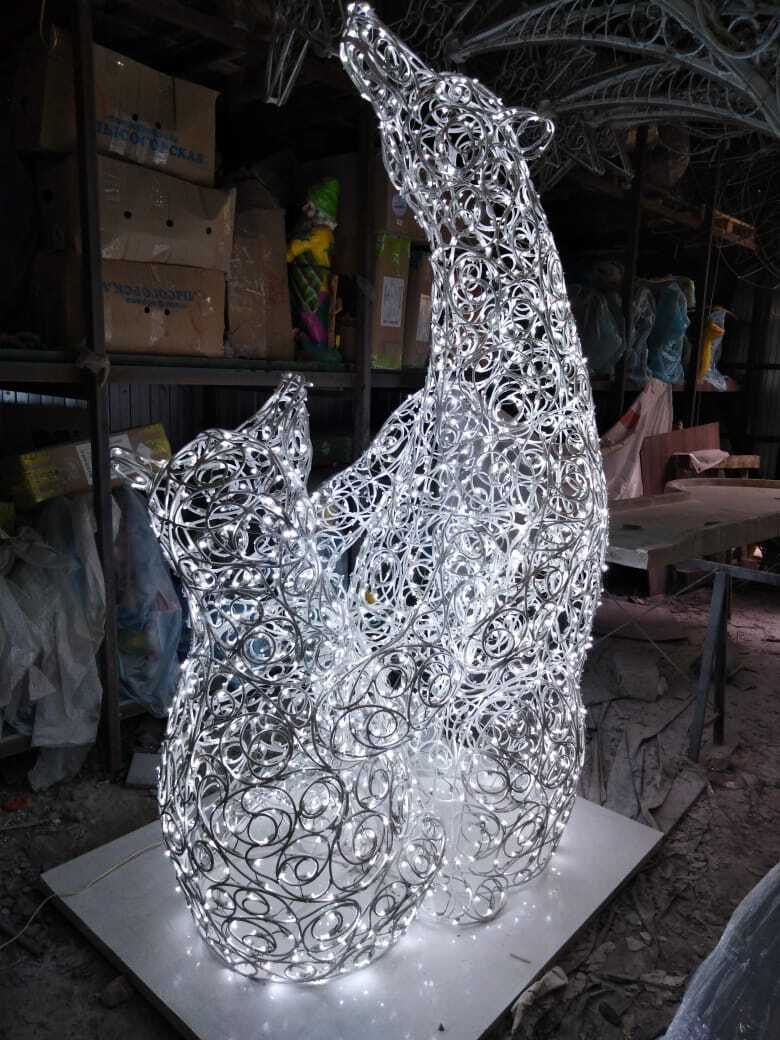 Фигура декорирована светодиодами с защиты IP 67 повышенного свечения. Свечение статичное. Проволока и профильная труба обработаны путем порошкового окрашивания, что позволяет эксплуатировать данные изделия на улице.